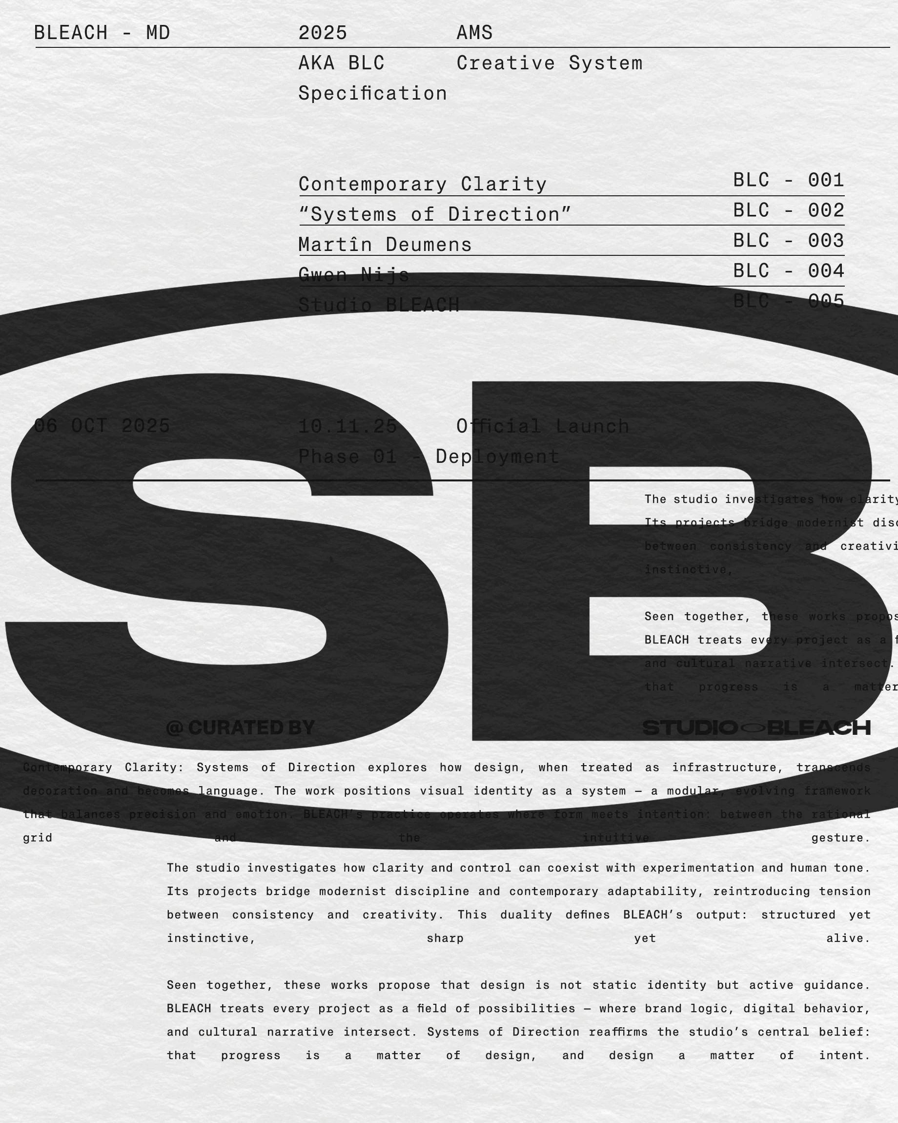 Every element, from stationery to digital environments, is built to feel functional yet elevated. The website, pitch decks, and printed materials follow one modular architecture that evolves as the studio grows.BLEACH does not aim to impress through decoration but through precision. It represents a mindset: design as direction, not distraction.
